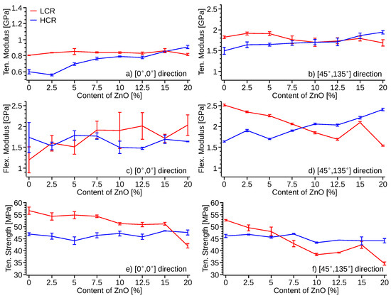 Average tensile and flexural test results of specimens 3D printed with HCR (blue) and LCR (red). Elastic modulus from tensile test (a) [0°, 0°] infill direction, (b) [45°, 135°] infill direction, flexural modulus from three-point bending (c) [0°, 0°] infill direction, (d) [45°, 135°] infill direction, tensile strength of 3D printed specimens with (e) [0°, 0°] infill direction, and (f) [45°, 135°] infill direction.