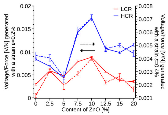 The electrical response (Video S1) of the 3D printed specimens was also measured. The three DMA samples, with infill direction of [45°, 135°], were coated with conductive nickel paint with an averageresistance of 2.2 ± 0.2 Ω at 25 mm. These samples were subjected to 6 Hz cyclic loading, a 0.2% and 0.4% strain amplitude with a span of 25 mm. When the locking amplifier was set to match the driven frequency of the DMA (Figures S10 and S11), the signal saturate at the peak voltage, reaching a maximum after two seconds of oscillating input. The driving force of the DMA was calculated as a function of the measured elastic modulus of the samples (Figure 10d) and the input strain. The measured voltage was related to the force and plotted as a function of the content of ZnO (Figure 11). Samples with 7.5–15% ZnO produced a two fold increment of the voltage per unit force with respect of the pristine PVDF samples. Furthermore, the HCR samples produced ≈70% increment of the generated voltage compare to the LCR and approximately a four times higher voltage per unit force (Figure 11) for HCR 10% ZnO-PVDF with respect of LCR pristine PVDF. These results correlate with the FTIR (Figure 5) and DSC (Figure 4) measurements, which show that samples with 7.5–15% ZnO had a larger percentage of β phase. ZnO nanoparticles may have also improve the charge motion to the electrodes, in accordance with Zhang et al. findings, and thus increasing the voltage signal [60].