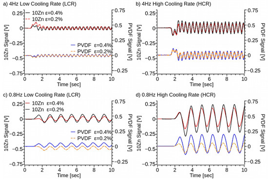 Voltage signal generated by the 3D printed PVDF and ZnO-PVDF in response to a 0.2% and 0.4% sinusoidal strain at a frequency of: (a) 4 Hz for LCR samples, (b) 4 Hz for HCR samples, (c) 0.8 Hz for LCR samples, and (d) 0.8 Hz for HCR samples.