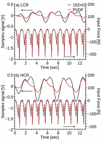 Since the 10ZnO specimens produce a better electrical response, they were also tested by applying a strain that simulates a walking profile (Figure 13) of an average person (Video S2) [41,61]. The walking profile was set to a maximum deflection amplitude of 2 mm, while the MTS test frame measured the force, and the sample signal was amplified and measured with the same setup from previous experiments. The 10Zn samples, HCR and LCR, were capable of reproducing the input signal (Figure 13) with higher accuracy than the signal of pristine PVDF samples (Video S2). Similar to the frequency tests on the DMA samples (Figure 12) and due to the superimposed frequencies of the walking profile, there is a frequency mismatch with respect to the applied wave. The HCR specimens for the PVDF and 10Zn specimens produced ≈2 times more volts per newton compared to the LCR specimens. The 10Zn also produced a ≈30% and ≈20% increase in V/N than pristine PVDF samples for HCR and LCR specimens, respectively. The 10Zn samples, HCR and LCR, were capable of reproducing the input signal (Figure 13) with higher accuracy than the pristine PVDF samples (Video S2). The increased signal of the 10Zn samples with respect to pristine PVDF is similar to the observed V/N at a constant driving frequency (Figure 12). Two 10ZnO samples were tested (Figure S12) under the same condition producing an equivalent electrical response to the applied load. Similarly, the two PVDF specimens produced an equivalent response. These results suggest that the 3D printed ZnO-PVDF composite material is repeatable and correlates to the locking amplifier’s matching frequency. Thus, the need for a frequency response characterization of the sensor, which is outside of the scope of the current project.