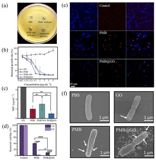 Enhanced antibacterial activity of the PMB@GO nanocomposites. (a) Inhibition zones of PMB@GO against E. coli in the agar hole diffusion-inhibition zone method. The assay performed with phosphate buffer solution (PBS) is used as the control. The conditions of free PMB and physical mixture of PMB and GO (i.e., PMB + GO) are also shown for comparison (at 16 μg mL−1 in terms of peptide). (b,c) Concentration-dependent bacterial viability (b) and MIC determination (c) of PMB@GO against E. coli. Free PMB, GO, and PMB + GO are shown as the control. p-values were calculated by t-test and ANOVA (ns means p > 0.05). (d) Proliferation capacity of E. coli after treatment with PMB and PMB@GO for 3 h or 6 h, respectively, with PBS as the control. p-values were calculated by t-test and ANOVA (**** p < 0.0001). (e,f) LIVE/DEAD staining (e) and SEM (f) images of microorganisms after treatment with PMB or PMB@GO at their 5 × MIC concentrations for 3 h. In (e), all bacteria: blue, dead bacteria: red, scale bar: 10 μm. White arrows in (f) representatively show the areas of heavy damage. PBS and GO (at 5 μg mL−1) are used as the control. E. coli was used as the test microorganism in these experiments.
