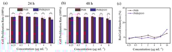 The hemolysis assay was performed as reported previously []. The red blood cell suspension was treated with free PMB or PMB@GO (from 0.25 to 16 μg mL−1) for 4 h at 37 °C. After that, the mixture was centrifuged at 5000 rpm for 10 min, and the OD value of the supernatant at 550 nm was measured. Ultrapure water was used as a positive control, and PBS served as the negative control.