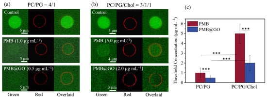 To further understand the membrane activity of PMB@GO nanocomposite over different membranes (i.e., the bacterial and mammalian cell membranes), the giant unilamellar vesicle (GUV) leakage assay, which has been generally used to evaluate the membrane permeabilization effect of agents, was performed [,,,]. GUVs containing calcein, a water-soluble and membrane-impermeable fluorophore, were prepared following the traditional electro-formation method []. Specifically, the GUVs consisting of neutral 1,2-dioleoyl-sn-glycero-3-phosphocholine (DOPC) and negatively charged 1,2-dioleoyl-sn-glycero-3-phospho-(1’-rac-glycerol) (DOPG) in a 4:1 ratio were used to mimic the bacterial cell membranes as performed in previous studies [,]. In contrast, cholesterol (Chol), which is a key membrane component of mammalian cells and is absent in bacterial membranes, was involved to prepare the GUVs, mimicking the mammalian cell membranes (with PC:PG:Chol = 3:1:1 by mol). All the GUVs, labeled with 0.1 wt% 1,2-dioleoyl-sn-glycero-3-phosphoethanolamine-N-(lissamine rhodamine B sulfonyl) (RhB-PE), kept stable without calcein leakage for more than four hours under CLSM observation. However, after the addition of agents above threshold concentrations, obvious leakage of calcein was observed. Figure 4a,b show representative images of GUVs after agent incubation for 30 min. For the PC/PG membranes, the addition of PMB at a concentration of 1.0 μg mL−1 induces obvious calcein leakage to half of the GUVs in the system, indicating agent-induced membrane permeabilization. In contrast, for PMB@GO, the threshold concentration is reduced to 0.5 μg mL−1 (at which 60% of the vesicles leak). Briefly, these results suggest an enhanced membrane-permeabilization ability of PMB@GO compared with free PMB, which might be the reason of the enhanced antibacterial ability of the composite.