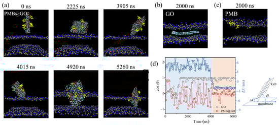The antibacterial and GUV-permeabilization results above suggest a synergistic effect in membrane action between PMB and GO in the PMB@GO nanocomposite system. To give an insight into the underlying mechanism, MD simulations were performed to investigate the interaction process between agents and a bilayer membrane. Here, a well-established coarse-grained (CG) Martini force field was applied in the simulations [,]. It is found that the GO nanosheet tends to insert into the membrane quickly (within 2000 ns) and then be stably sandwiched between the two leaflets, whatever the initial orientations are (even when it is originally vertical to the membrane plane; Figure 5b and Figure S3a). On the other hand, the free PMB tends to embed shallowly to the membrane (Figure 5c and Figure S3b). These results are consistent with previous observations [,]. Moreover, after the embedding of GO or PMB, the membrane keeps intact without obvious disturbance of the bilayer structure.