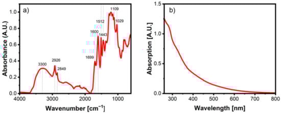 Figure 2. (a) FTIR spectra of lignin; (b) UV/vis spectrum of lignin.