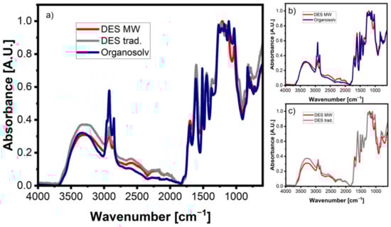 Figure 3. (a) FTIR spectra of lignin: MW DES, traditional DES and organosolv; (b) comparison of FTIR spectra MW DES and organosolv lignin; (c) comparison of FTIR spectra MW DES and traditional DES lignin.