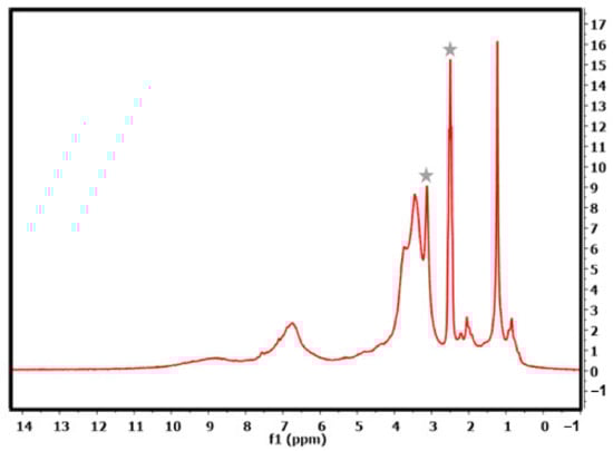 1H-NMR spectroscopy represents another way to gain valuable insights and analyse lignin. One example is the extensive study of Lundquist et al. into the phenolic groups of underivatized lignin [55]. DMSO-d6 was used as solvent, as it is known for its slow proton exchange and, hence, can show the characteristic lignin hydroxyl protons better than other deuterated solvents. The NMR spectrum in Figure 4 shows several clearly resolved peaks, which belong to proton signals of certain structural building blocks of lignin. One example is the spectral range of δ 10.0–9.0 ppm. The signals in this area mainly stem from formyl groups as well as some phenolic hydroxyl groups. Unsubstituted phenolic groups, which are not conjugated to carbonyl groups, can be found in the area of δ 9.0–8.5 ppm. Further up field, between δ 8.5 and 8.0 ppm, signals of substituted phenolic moieties appear. The signal at 7.5–6.0 ppm belongs to the aromatic and vinylic groups in the lignin structure, while the signal 6.0–4.0 ppm stems from aliphatic Hα and Hβ protons. The very prominent broad peak at 4.0–3.3 ppm resembles the methoxy and Hγ groups. Further upfield, smaller peaks between 2.2 and 2.0 appear, which belong to hydrogens on aromatic units, while the very sharp peak at 1.5–1.0 ppm belongs to various aliphatic CH2-CH2 elements. The signal at 0.85 represents the terminal CH3 moieties in the lignin structure.