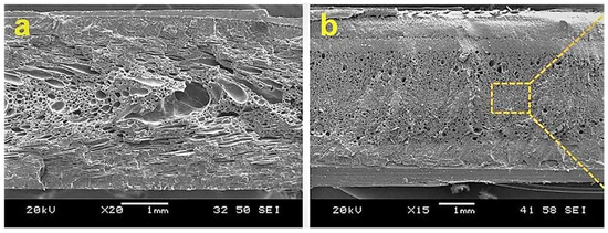 Scanning electron microscopy (SEM) image of foamed samples: (a) pure PLA foam prepared by regular micropore injection molding, (b) pure PLA foam High-pressure microwell injection molding (reproduced with permission from Reference [79], Copyright 2022 Elsevier).