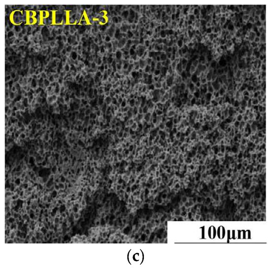 SEM images of branched PLLA and branched PLLA/TMC foam at 130 °C: (a) pure PLLA; (b) 1 wt% TMC-300; (c) 3 wt% TMC-300 (reproduced with permission from Reference [91], Copyright 2022 Elsevier).