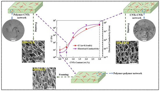 Schematic diagram of three possible network structures of PLA/CNTS foams (reproduced with permission from Reference [95], Copyright 2020 Elsevier).