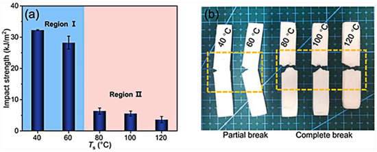 As shown in Figure 3, temperature-induced foaming means that the polymer is first saturated in the reactor at low temperature and low pressure and then removed from the reactor and quickly put into a certain temperature medium (usually hot water, oil, etc.) for heat bath-induced foaming. When choosing water bath-induced foaming, the ease of hydrolysis of PLA should be taken into account, which may impact the performance of the foamed material, although temperature-induced foaming is a relatively short process. Sun et al. [67] prepared PLLA/PBS/PDLA composite foam by temperature-induced intermittent foaming. The effects of the introduction of poly(butylene succinate) (PBS) and PDLA on the crystallization behavior and cellular structure of PLLA were investigated. It was found that the introduction of both polymers resulted in the formation of stereo-complex crystals in the PLLA matrix. This stereo-complex structure, while limiting the movement of molecular chains, reduced the nucleation rate of PBS. However, it improves the compatibility of PLLA/PBS composites, plays a positive role in foaming, refines the micropore size, and provides the idea of using PLA stereo-crystals to improve the foaming behavior of PLA. Zhang et al. [71] prepared CA/PLA composite foams using a temperature-induced intermittent foaming method to investigate cellulose acetate foam’s properties (CA). The results illustrated that the addition of PLA reduced the system’s storage modulus and complex viscosity, increased the loss factor, and improved the rheological properties of CA. The cell size increased, and the impact strength of the foam slightly decreased with the increase of PLA content.