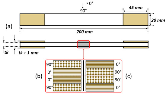 The specimen’s geometry is based on the ASTM D3039 standard. Detailed dimensions of the specimen can be seen in Figure 1a, with the thickness of the sample being 3 mm. Two different stacking sequences of GFRP laminates were manufactured with the size 200 × 200 mm—[90/0]S and [0/90]S—as shown in Figure 1b,c. Specimens were placed at room temperature for 24 h before being cut to ensure the laminates were fully cured. The specimens were tapped with 0.5 mm aluminum and glued with the epoxy to allow bonding between GFRP and aluminum after the surface of the aluminum and GFRP was sanded using P250 abrasive paper.