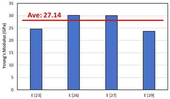 According to the previous works [29,30], Aij is the extensional stiffnesses, Bij is the bending–extension coupling stiffnesses, and Dij is the bending stiffnesses. Since the laminates are symmetric and tensile loading was used to evaluate the laminates, the value of modulus elasticity can be directly gathered from . A detailed prediction of Young’s modulus can be seen in Figure 3. It is shown that the average Young’s modulus from the previous study was 27.14 GPa, whereas we compared data of the Young’s modulus in the present study with these data.
