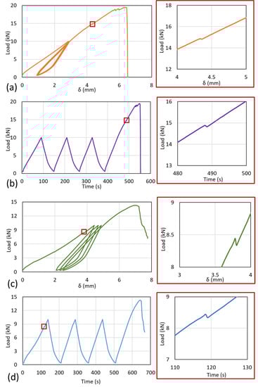 Stepwise loading from the different specimens. The [90/0]S sample with (a) load vs. displacement and (b) load–time. The [0/90]S sample with (c) load vs. displacement and (d) load–time.