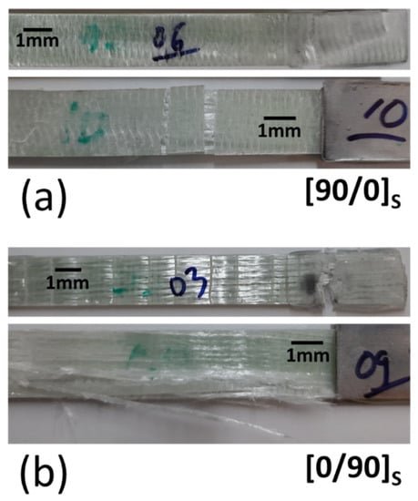 Specimen conditions where the failure was spotted after the test (macro images). (a) [90/0]S. (b) [0/90]S.