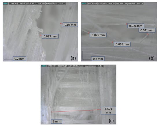 The specimen was then checked using a microscope to determine the detailed failure mechanism, as shown in Figure 6. Failures were spotted in different forms. Figure 6a showed that the fiber breakage clearly appeared. The fibers and matrix were also stuck together. In a different location, individual fibers were spotted after failure, as shown in Figure 6b. The fiber diameter ranged from 18 µm to 31 µm. These fibers were spotted due to matrix damage, and the fibers were spread at random angles. Another failure due to matrix damage is shown in Figure 6c. It is shown that the damage occurred in form of separated fiber at a 90° angle, making fibers at a 0° angle clearly visible. The gap after failure was around 5.5 mm.