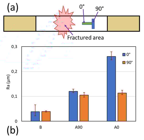 (a) The area’s position for gathering surface roughness data. (b) Ra results of the specimen. B is the specimen before the test, A90 is the [90/0]S specimen, and A0 is the [0/90]S specimen.