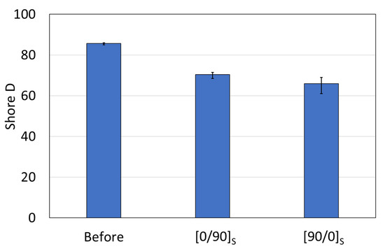 - The shore D hardness before was recorded with 85.6 then decreased to 70.4 for [0/90]S and 65.9 for [90/0]S.