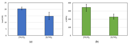 A summary of the maximum loading and ultimate stress of the specimen can be seen in Figure 11. The average load for the [90/0]S specimen was 20.3 kN and for the [0/90]S specimen was 14.7 kN. Moreover, the strength values were 344.45 MPa and 227.8 MPa for the [90/0]S specimen and [0/90]S specimen, respectively. The results indicated that the preliminary failure that occurred during the first, second, or third load can reduce the strength of the specimen drastically. This is comparable to the [90/0]S specimen, where preliminary failure occurred in the final loading.