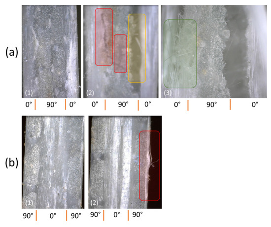 The results from further analysis during the tensile loading of the specimen can be seen in Figure 12. Data from before and after the test for the [0/90]S specimen can be seen in Figure 12a. The specimen condition during loading (1) and after the test (2 and 3) are illustrated. Matrix debonding is clearly shown in the red rectangle, followed by layer delamination between the 90° layer and 0° layer, as shown in the yellow rectangle. As shown in the green rectangle, the breaking of the fiber indicates the specimen’s final failure. Furthermore, the conditions for the [90/0]S specimen before and after the test are shown in Figure 12b. The fiber delamination from the 0° layers was revealed, where the condition of the specimen was not fully damaged like the [0/90]S specimen. These findings showed that, for the specimen that needs to maintain the overall condition, the edge layers should be avoided using the 0° layer. This is because the preliminary crack and failure occurred.