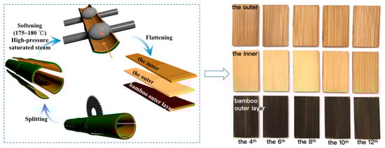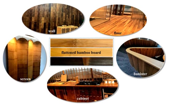 Bamboo has long been regarded as a natural polymeric composite material, and its fibers are mainly used as reinforcement for natural fiber-reinforced polymeric composites []. Flattened bamboo boards are obtained from bamboo culms by softening and flattening at high temperature []. Hemicelluloses, lignin, and noncrystaline cellulose, which are polymeric amorphous constituents in the bamboo cell wall, exhibit viscoelastic behavior when exposed to this high temperature (glass transition temperature), allowing bamboo culms to flatten with pressure [,]. With the pyrolysis of a small part of these bio-polymers, the color of flattened bamboo boards is darker. Color is one of the important quality indexes of bamboo products that affect consumer preference and the added value of bamboo-based products [,]. In recent years, flattened bamboo boards have been gradually applied to interior decoration and furniture (Figure 1). Flattened bamboo board not only has high mechanical properties [], but also maintains the natural texture of bamboo. In addition, as bamboo flattening technology can include or remove the bamboo outer layer [], the flattened bamboo board has a variety of colors, providing a good decorative effect when used for furniture.