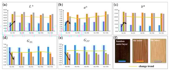 The changing treed and difference of visual physical quantities in different bamboo culm parts. (a–e) corresponding to variation trends of L*, a*, b*, GZL and GZT parameters, (f) the macro images of three types of flattened bamboo boards. Black arrow refers to the variation trend of each visual physical quantity among three types of boards; the orange dotted broken line indicates the change trend of each visual physical quantity at different internodes.