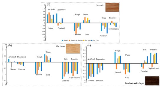 Principal component analysis was performed on the visual psychological quantities of the six pairs of semantic adjectives used, with the goal of summarizing similar evaluation patterns among these flattened bamboo boards. Table 7 presents a summary of the items and loadings obtained by principal component analysis in each type of flattened bamboo boards. The three Kaiser–Meyer–Olkin (KMO) values were greater than 0.6, and the data passed Bartlett’s sphericity test (p < 0.05), indicating that the research data were suitable for principal component analysis. After considering the scree plot and cumulative contribution ratio after extraction (the outer: 82%; the inner: 86%; bamboo outer layer: 87%), four pairs of semantic adjectives (including practical–decorative, cold–warm, comfort–sick and sophisticated–primitive) were selected as principal components. However, as both “nature–artificial” and “smooth–rough” had high factor loadings, they were retained as the evaluation parameters of the visual psychological quantity of bamboo. Interestingly, although the factor loadings of the six pairs of semantic adjectives were different among the three flattened bamboo boards, their PC order was approximately the same. This also suggests that six affective properties adjectives for visually evaluating the flattened bamboo board surface are necessary. This result is consistent with the affective properties selected by [] in the evaluation of bamboo filament.