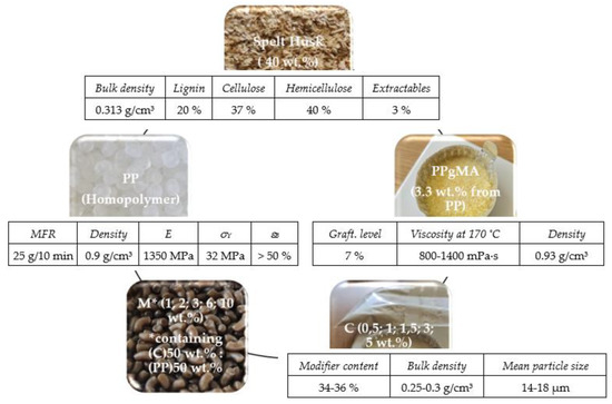 Injection-moulding-grade polypropylene homopolymer (PP, Moplen HP400R, Bassel Orlen Co., Płock, Warszaw, Poland) was used as a matrix. This homopolymer exhibits good stiffness and high fluidity (MFR = 25 (230 °C/2.16 kg), necessary for injection-moulding applications. Polypropylene-graft-maleic anhydride (PPgMA, Clariant Co., Licocene PP MA 6452, Muttenz, Switzerland) in the amount of 3.3 wt.% in relation to the matrix was used as a coupling agent between the nonpolar matrix and polar lignocellulosic fibres. Spelt husks (SH, Amilina AB Co., Panevėžys, Lithuania) microfiller used as lignocellulosic reinforcement was obtained by mechanical milling. Two types of organoclays containing fillers, neat nanoclay (C, Nanomer I.44P, Nanocor Co., Hoffman Estates, IL, USA ), and organoclay masterbatch (M, Masterbatch I.44P, Nanocor Co., Hoffman Estates, IL, USA), were used as co-modifiers. A visual summary of all the raw materials is shown in Figure 1, along with their main physical characteristics.