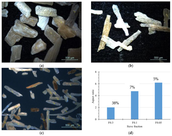 Light microscopy images of SH after sieving through 0.5 mm (a), 0.3 mm (b), and 0.1 mm (c); size sieves and calculated average aspect ratios of the respective sieve fractions and their per cent amounts (d).