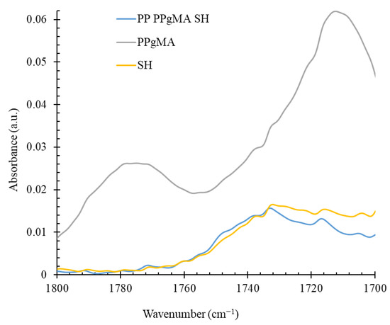 FTIR spectra in the region of absorption of carbonyl groups of SH, PPSH, and PPgMA are summarized in Figure 4. It has been well accepted that interaction between hydroxyl groups of lignocellulosic filler and maleic anhydride functional groups in PPgMA occurs via an esterification reaction leading to the formation of ester carbonyl groups. In Figure 4, it is demonstrated that absorption of the maleic anhydride groups grafted to PP occurs in the range between 1760 cm−1 and 1800 cm−1, with broad maxima from 1772 cm−1 to 1780 cm−1. After compounding with SH, absorption in this region is considerably decreased, whereas new signals have been observed in the range between 1744 cm−1 and 1746 cm−1. These signals may be attributed to the esterification reaction between free hydroxyl groups of SH and maleic anhydride functional groups of PPgMA.
