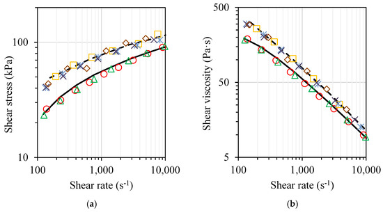 As depicted in Figure 5, in the investigated shear rate range, all the examined materials show a shear-thinning non-Newtonian behaviour caused by the disentanglement process and an increase in the average end-to-end distance of polymer chains as a result of shearing. Considerable shear stress and viscosity increase is observed along with the introduction of 40 wt.% of SH in the polymer matrix, whereas the effect of the addition of high surface area nanostructured nanoclay filler (C or M) is much lower.