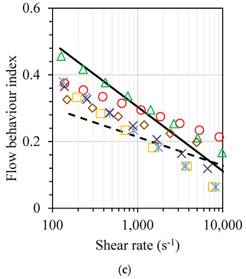However, it should be mentioned that at larger shear rate values approaching 10,000 s−1, viscosities of SH, C- and M-containing systems become rather similar. Evidently, at larger shear stress values, due to the orientation of the microphase lignocellulosic filler, its effect on the flow behaviour of the polymer composite melt becomes smaller. By analysing the viscosity and shear stresses of M- and C-containing systems, one can observe somewhat smaller data scatter. Hence, a more stable flow is observed in the case of clay masterbatch (M)-modified systems, especially in the case of hybrid composites with SH (see Figure 5a). By considering that in the certain shear rate region τ(γ·) and η(γ·) relationships are linear, the power law model is applied, allowing the determination of pseudoplasticity of the investigated systems. As demonstrated in Figure 5c, considerable differences in the pseudoplastic behaviour of the investigated systems are observed after the introduction of both SH and nanoclay containing reinforcing fillers. Upon the addition of micron-sized SH in the PP matrix melt, considerable changes in pseudoplastic behaviour are observed at lower shear rates range, whereas at high shear rates approaching 10,000 s−1, the value of flow behaviour index of the lignocellulosic filler-containing composite almost coincides with that of neat PP matrix. It is also worth mentioning that because of better dispersibility, the addition of the clay nanofiller in the form of masterbatch influences the pseudoplasticity of PP nanocomposites and PP hybrid composites considerably less in comparison with the systems containing neat nanoclay filler.
