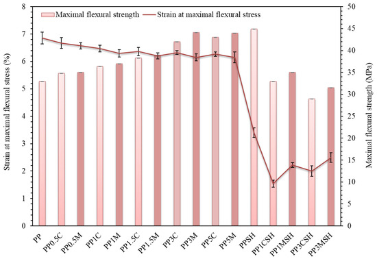 Strain at maximal flexural stress and maximal flexural strength of PP composites and neat PP; darker bars are related to the masterbatch-containing systems.