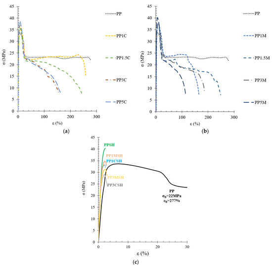 Tensile stress–strain diagrams of PP nanocomposites with C (a), M (b), and PP hybrid composites with SH and nanoclay (c).