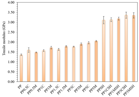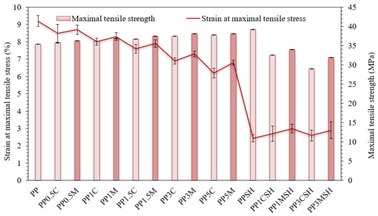 A more detailed analysis of the results of the tensile test is depicted in Figure 9 and Figure 10. Tensile modulus, as well as the maximal tensile stress and strain values, are analysed. It is worth mentioning that in the case of the nanoclay-reinforced binary composites, the corresponding stress–strain values are attributed to the upper yield point, whereas in the case of hybrid composites, the corresponding stress–strain values are attributed to the fracture point. In general, the tensile behaviour of the investigated PP composites has similar trends to flexural behaviour. Consequently, the addition of only nanoclay results in increased modulus and strength of the nanocomposite by maintaining remarkable ultimate deformation values (even up to 150% at the highest nanofiller content), whereas the addition of nanoclay nanofiller to SH-containing PP composites further increases it brittleness (Figure 9 and Figure 10).