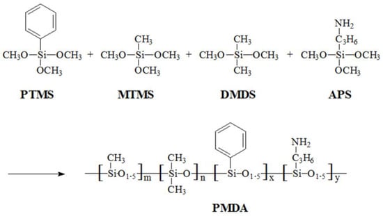 Dimethyldimethoxysilane (DMDS) and phenyltrimethoxysilane (PTMS) of reagent grade were supplied from Gelest Chemical Reagent Co., Ltd. (Morrisville, PA, USA). Methyltrimethoxysilane (MTMS), tetramethylammonium hydroxide (TMAOH) and (3-aminopropyl)trimethoxysilane (APS) were all provided by Alfa Aesar Chemical Reagent Co. Ltd. (Tewksbury, MA, USA). Trimethylolpropane tris(3-mercaptopropionate) (3T) was obtained from Bruno Bock Chemische Fabrik Gmblt & Co. (Marschacht, Germany) and used as received. Ethyl alcohol (EtOH), 2,2-dimethoxy-2-phenylacetophenone (DMPA) and pentaerythritol allyl ether (TAE) were purchased from Sigma-Aldrich Reagent Co. Ltd. (St. Louis, MO, USA).