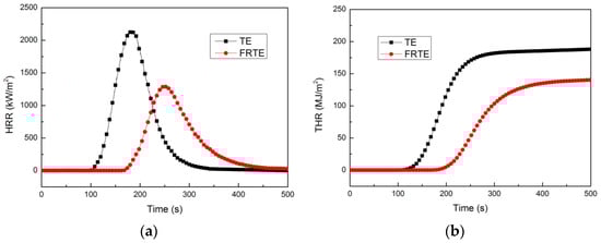 The cone calorimetry uses an oxygen consumption calorimeter to measure the combustion rate and amount of heating. Because the test process is very close to the actual fire situation, it is one of the most effective experimental methods to study the combustion characteristics of polymer materials. Figure 2 illustrates the plots of heat release rate (HRR) and total heat release (THR) versus the temperature of the TE composites. The neat TE exhibited a higher peak of heat release rate (PHRR) of 2152.4 kW/m2 and a THR of 188.0 MJ/m2. For the FRTE composite, the PHRR was significantly suppressed by 39.4%, from 2152.4 kW/m2 to 1304.9 kW/m2. Further reduction of THR from 188.0 MJ/m2 to 140.3 MJ/m2 was observed for FRTE, which was reduced by 25.4%. The decrease of HRR and THR indicated that the incorporation of PMDA into polymer composites could restrict fire development [,].