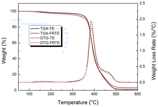 The fire resistance of materials is closely related to its thermal stability. Currently, TGA is one of the most widely used techniques to rapidly assess the thermal stability of various polymer composites. The thermal properties of TE and FRTE were studied by TGA at heating rates of 10 °C/min under N2 atmosphere, as shown in Figure 3 and Table 1. It can be seen that the onset degradation temperature (T5wt%) of neat TE occurred at about 345.7 °C. With the incorporation of 5 wt% PMDA, the T5wt% of FRTE dropped to 316.1 °C, this was mainly due to the condensation reaction of residual silanols and methoxy groups on PMDA. However, the temperature of the peak rate (Tmax) for FRTE was slightly higher than that of neat TE, and the main degradation of TE composites was shifted to a higher temperature by the introduction of PMDA.