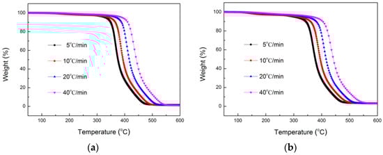 TGA and DTG curves of TE composites in a nitrogen atmosphere were measured at heating rates of 5, 10, 20 and 40 °C/min. As the heating rate increased (Figure 4 and Figure 5), the thermograms shifted to the higher temperature region. At a low heating rate, it was easy to reach equilibrium at any point with the increase of temperature. When the heating rate was too fast, due to slow diffusion of heat, the equilibrium was slow, the curve shifted to the high temperature region, and therefore the degradation point (or degradation temperature) was high.