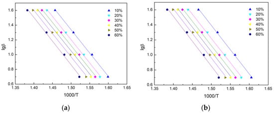 The equation of Flynn–Wall–Ozawa method is as follows [,]: