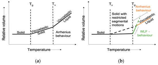 Temperature dependent phase transitions of vitrimers. (a) Tg below Tv and (b) Tv above Tg. Reproduced with permission [].