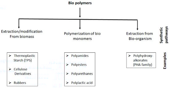 Furthermore, biopolymers have been developed using different bio-derivatives obtained through various pathways including resources such as plant oils, [,] lignite [,,] saccharides, [] and isosorbides [,]. Generally, biopolymers (or) bio-plastics are derived from different pathways like (a) extraction/ modification of bio-mass; (b) polymerization of bio-monomers; and (c) extraction from bio-organisms (Figure 2) []. For example, natural rubber is collected from “Hevea braziliensis” trees, where collected rubber requires processing with hardener to attain commercial products such as tires [], whereas starch-derived polymers are prepared via a “gelatinization” process []. Moreover, the starch granules processed bio-polymers have been widely used in packaging industries, along with different plasticizers like glycerol, polyol and sorbitol []. Researchers have also focused on the development of bio-composites, including bio-derived or bio-blends consisting of different percentages of bio/synthetic derivatives [,].