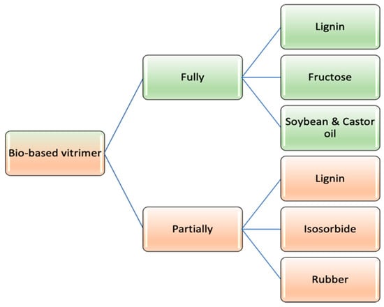 Based on the involvement of renewable sources, vitrimeric materials can be classified as labelled in Figure 3 [], where fully bio-based vitrimers are synthesized using only bio-derived chemicals, whereas in the case of partial bio-vitrimers, the network formation can be achieved using petroleum based molecules along with bio-derived chemicals.