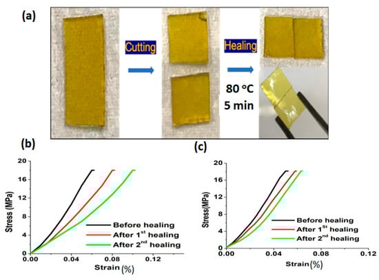 (a) Self-healing of the epoxy vitrimer (i) pristine EP-p, (ii) cut into two pieces, and (iii) rejoined. Healing efficiency of vitrimer was calculated via the stress-strain relationship for (b) EP-p and (c) EP-1. Reproduced with permission [].