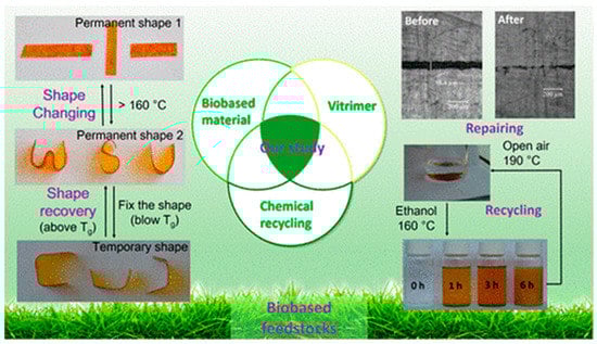 Lignin-derived eugenol-based epoxy vitrimers have been prepared by Zhang and coworkers, where transesterification reaction promoted covalent adaptive network exchanges were achieved. The synthesized eugenol epoxy was further reacted with succinic anhydride (SA) in the presence of zinc catalyst []. The performed eugenol derived epoxy vitrimer demonstrates self-healing at 190 °C, and shape memory and fast stress relaxation at 80 °C and 200 °C, respectively. Hence recycling of the material was achieved through physical and chemical principles, where the epoxy vitrimers were pocessed at 160 °C for 1h in hot press, and further the chemical degradation/decomposition of the polymer took place at 160 °C in the presence of ethanol (Figure 6). In another study, lignin derived vanillin based di-aldehyde monomer was treated with conventional diamine to obtain the corresponding bio-based vitrimers, where imine covalent exchange enables the physical reprocessing and chemical recycling. The dynamic imine metathesis reaction promotes self-healing at 180 °C for 1h. Cut sample shows optimal mechanical recovery after healing at 150 °C for 1 h (healing efficiency = 74.5%). At the same temperature, physical reprocessing was performed for 10 min, and the efficiency of reprocessed vitrimer was evaluated obtaining a 71.2% tensile strength and 72.8% elongation at break after three hot-pressing cycles. The chemical recycling was observed under an acidic environment at 50 °C, and the obtained aldehyde monomer can be reused again for the preparation of vitrimers [].