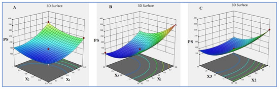 Three-dimensional response surface plot showing the effect of independent variables (A) X1 and X2; (B) X1 and X3; and (C) X2 and X3 on PS.