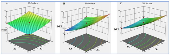 Three-dimensional-response surface plot showing effect of independent variables (A) X1 and X2; (B) X1 and X3; and (C) X2 and X3 on DEE.