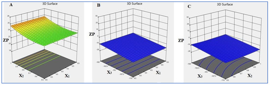 Three-dimensional-response surface plot showing effect of independent variables (A) X1 and X2; (B) X1 and X3; and (C) X2 and X3 on ZP.