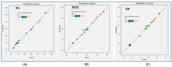 Predicted vs. actual plot representing the effects of X1 and X2 on the measured responses at the mid-level of X3 on (A) PS (Y1), (B) DEE (Y2), and (C) ZP (Y3).