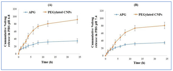 To estimate the in vivo release profile of APG, in vitro dissolution analyses were conducted in PBS at pH 6.8 and 7.4. In comparison to free drug suspensions, PEGylated CNPs showed controlled drug released, as observed in Figure 6A,B. A biphasic release was also found with an initial burst release of APG in the early phase, followed by a delayed release of APG in the later phase (up to 24 h). The optimized CNPs showed a sustained release, but the rate was a little higher in pH 6.8 than in PBS pH 7.4. In 8 h of study, about 74% of the drug was released at pH 6.8 and about 62% was released at pH 7.4. The burst effect could have been caused by APG elution near the surface during nanoparticle preparation, which then quickly dispersed when nanoparticles interacted with the dissolution medium. Because of the swelling or deterioration of the polymer, APG was slowly released later on. The remaining APG in nanoparticles did not entirely release until particles have been completely eroded or dissolved in the dissolution media because of the interaction between both the residual APG and the few amine groups of chitosan.